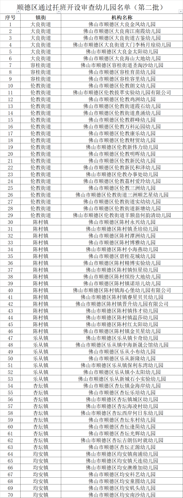 4月21日,佛山市顺德区教育局对第二批通过托班开设审查幼儿园名单进行公示,共70所幼儿园符合托班开设条件。