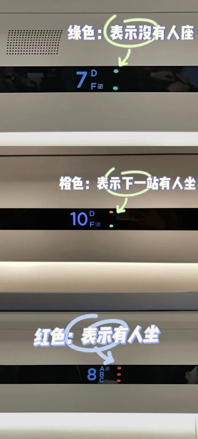 部分高铁列车的车厢上方座位号旁边会有三色指示灯,乘客也可以根据三色指示灯来查看座位使用的情况,其中绿灯亮表示此座席未售,无座乘客可以使用;红灯亮表示此座席已售,无座乘客不可使用;而黄灯亮表示该座席在当前站至下一区间未售,但是此座席的中间区段已售,无座乘客可在本区间使用。