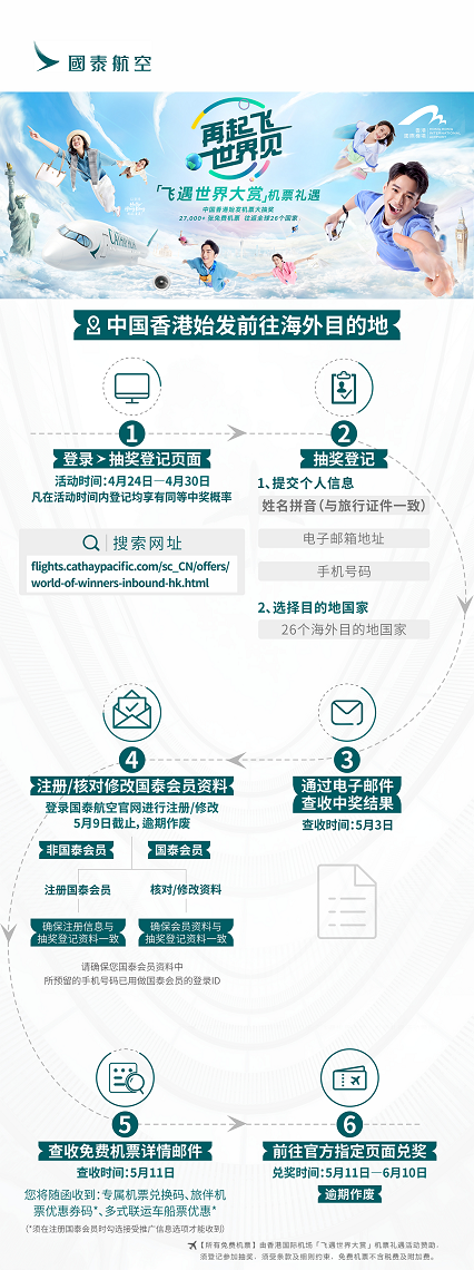 第二阶段将于4月24日至4月30日开启由中国香港前往海外的抽奖登记,届时同第一阶段一样,参与者登录国泰航空指定活动页面,提交个人信息,并选择目的地,即可参与抽奖。
