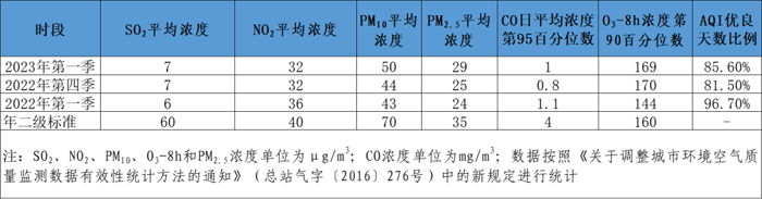 2023年第一季度,佛山市二氧化硫(SO2)、二氧化氮(NO2)、可吸入颗粒物(PM10)、细颗粒物(PM2.5)平均浓度分别为7、32、50、29微克/立方米,一氧化碳(CO)日平均浓度的第95百分位数为1.0毫克/立方米,臭氧日最大8小时滑动平均(O3-8h)浓度的第90百分位数为169微克/立方米。按照空气质量指数(AQI)评价,全市优良天数占整季度有效天数的85.6%。