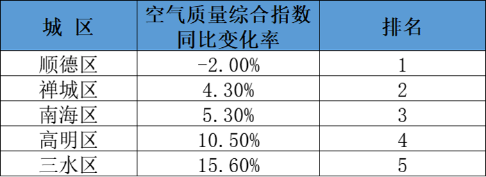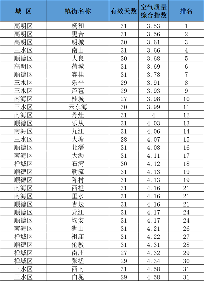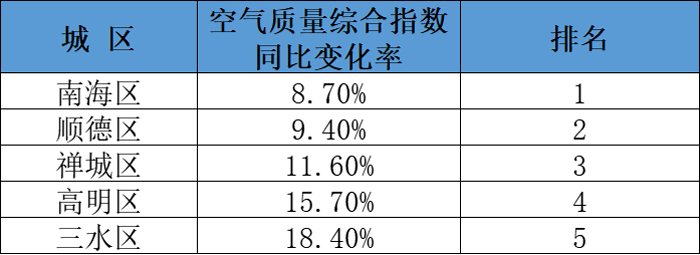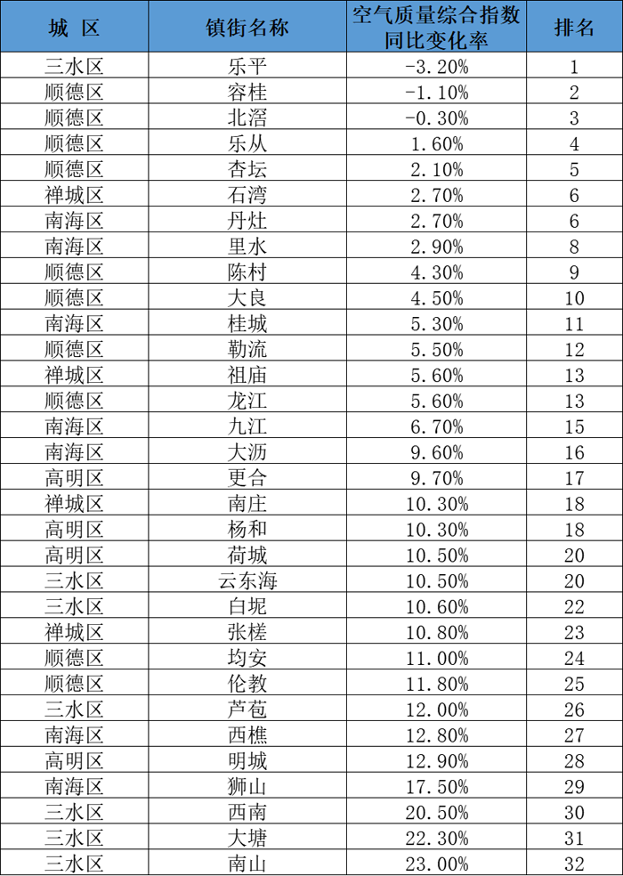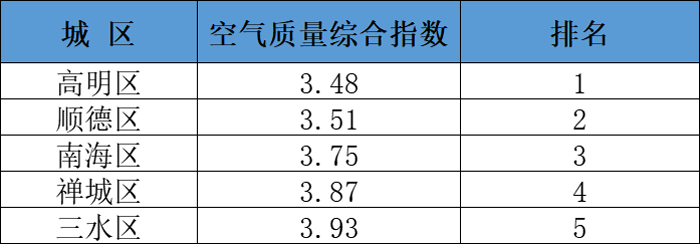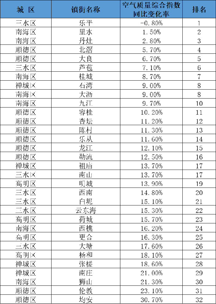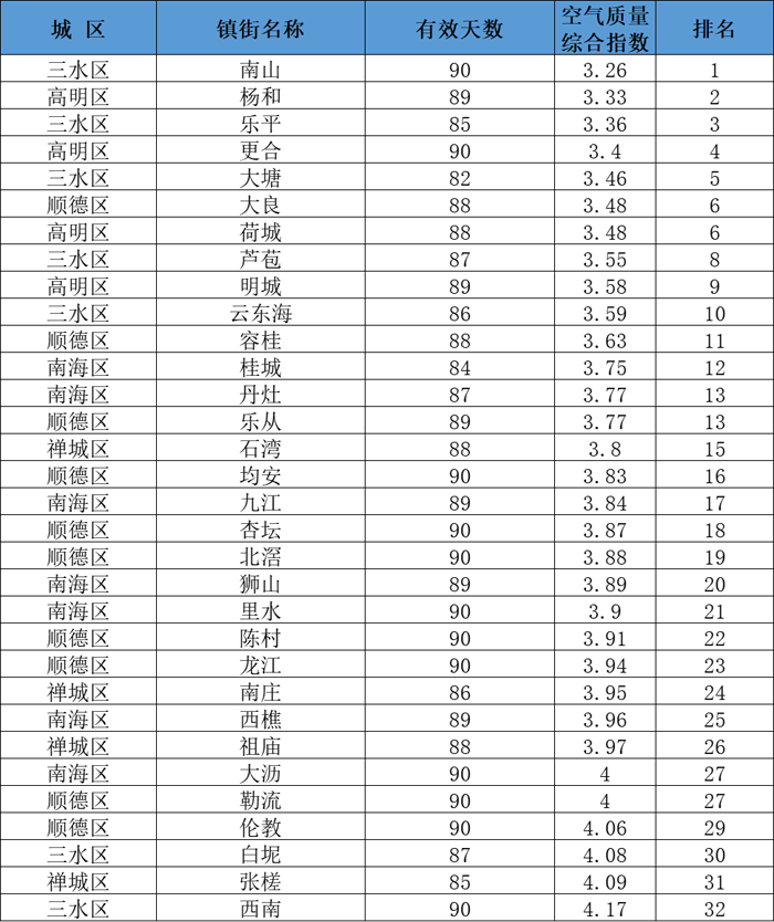 佛山市五区及镇街空气质量排名