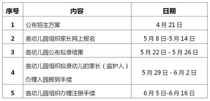 说明:拟录幼儿的家长(监护人)办理入园报到和注册手续的具体时间,由各幼儿园根据实际自行确定。