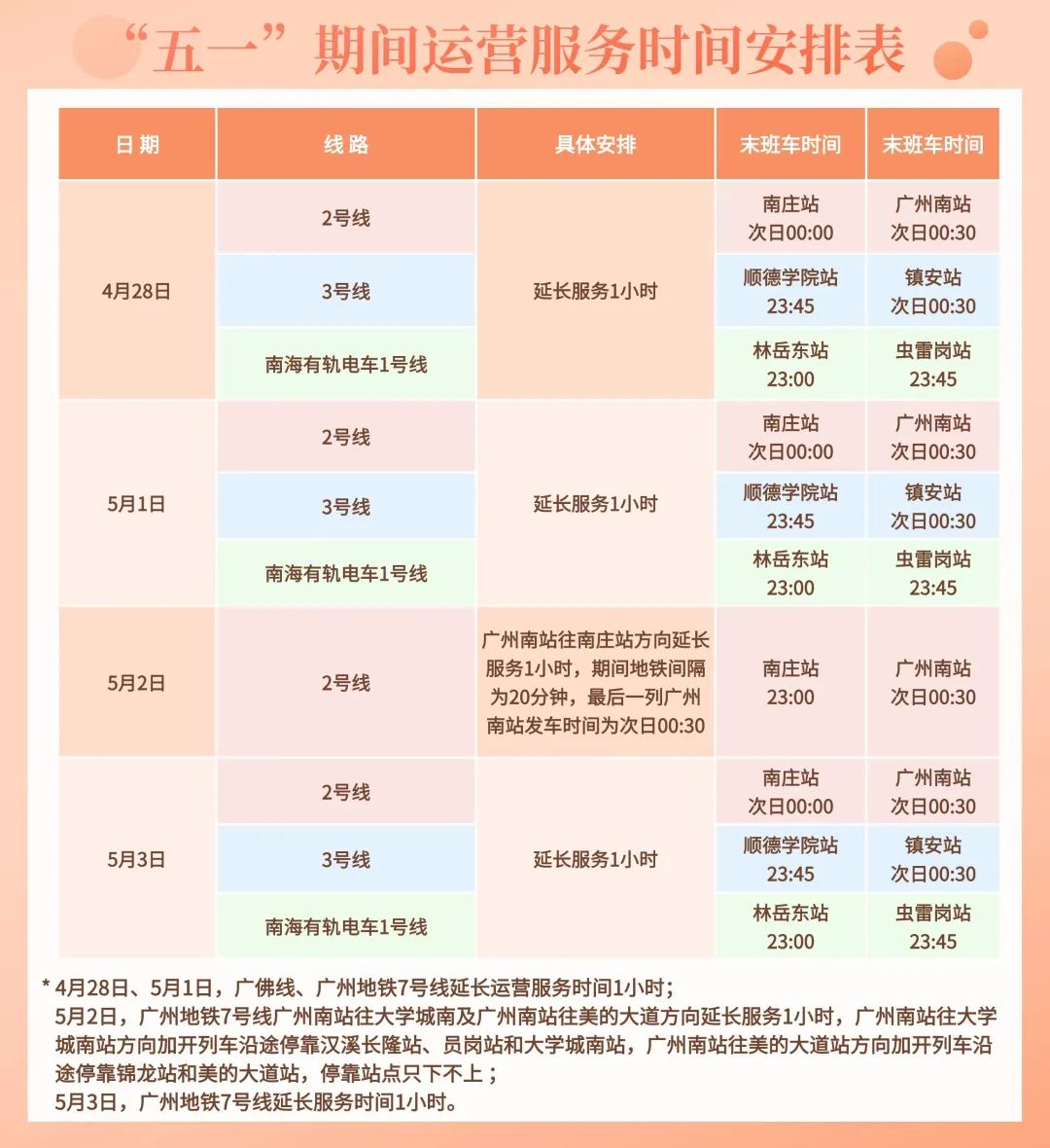 2023年“五一”假期(4月29日~5月3日)即将来临,为更好满足节假日客流需求,佛山地铁2号线、3号线,南海有轨电车1号线将于4月28日、5月1日、5月3日延长运营服务时间1小时;5月2日,佛山地铁2号线广州南站往南庄站方向延长运营服务时间1小时。