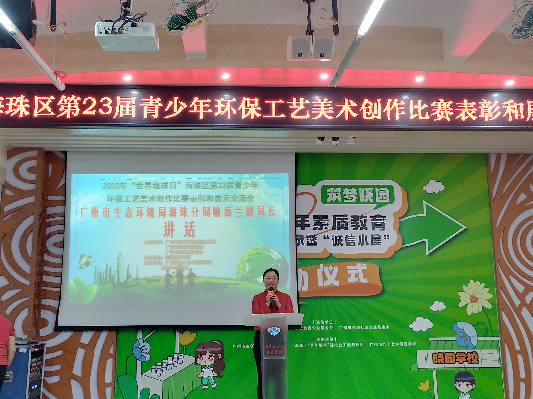 2023年4月22日是第54个世界地球日。广州市生态环境局海珠分局、广州市海珠区教育局和广州市环境科学学会在广州市九十七中晓园学校联合举办2023年 “世界地球日”海珠区第23届中小学环保工艺美术创作比赛表彰会和主题讲座。海珠区中小学师生代表、晓园中学全体师生参加。其他参赛学校通过线上直播观看。