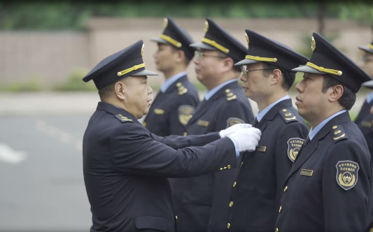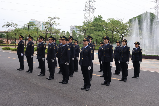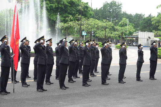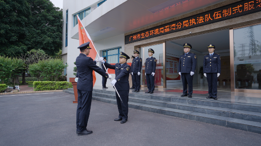 本次着装仪式共有6项议程:奏唱国歌;分局党组书记、局长郑占红为执法人员代表正冠;郑占红同志为执法人员代表授旗;王汉宁副局长带领全体执法人员向国旗宣誓;执法队伍方阵队列展示,接受分局领导检阅。最后,郑占红同志对荔湾分局生态环境执法队伍提出新要求、新希望。