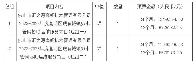 1、标的名称:佛山市汇之源高畅排水管理有限公司2023-2025年度高明区现有城镇排水管网协助运维服务项目