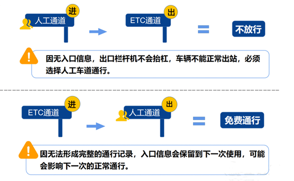 通过人工通道驶入高速的车辆,不建议在ETC车道下高速。因没有入口信息,出口栏杆机不会抬杆,只能折返至人工车道驶出,建议各位车主尽量选择同一类型车道(即在哪个通道上的就在哪个通道下),以免造成不必要的麻烦,尤其是ETC车辆。