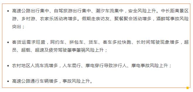 今年“五一”假期是春节后首个“长假”,从4月29日至5月3日共5天,群众旅游探亲积压需求加速释放,期间实施免收小型客车通行费政策,人员流动,客货流量明显增长,各类交通风险将交织叠加。