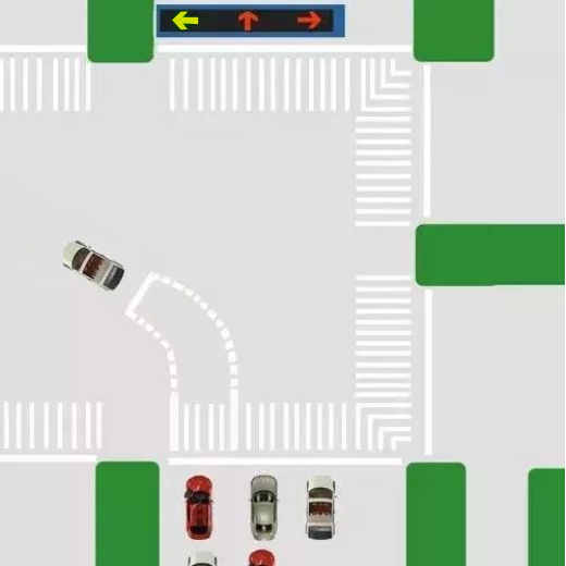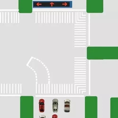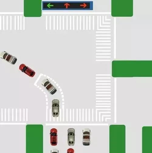 当左转信号灯绿灯亮起时,在待转区等候的车辆及后方左转车辆应迅速依次通过路口。