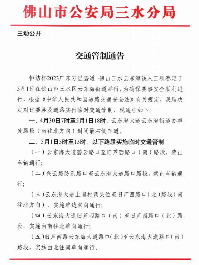 三水云东海4月30日-5月1日铁人三项赛涉及道路实行交通管制