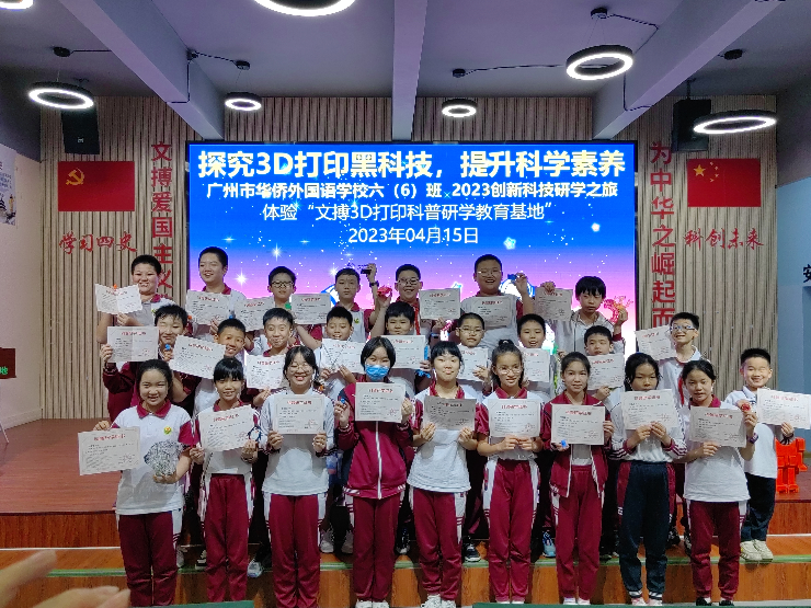 为营造热爱科学、崇尚科学氛围,培养学生积极探索、勇于创新精神,提高资源节约、环境保护意识,4月15日,受广州市生态环境局委托,广州市环境科学学会组织广州市华侨外国语学校六年级部分师生以及家长代表来到文搏3D打印科普研学教育基地,学习体验3D打印技术。