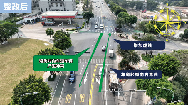 经过分析研判,工作专班确定采用调整车道宽度、标线“改直取弯”的方案,在确保通行安全的前提下,计算大货车转弯所需的车道宽度,通过缩减北段右侧一车道宽度,把节省下的宽度用于调整路口北段左侧车道宽度,使其与南段行驶路段方向保持一致,并在十字路口合适位置延伸导行线,指引通行车辆提前行使至对向车道。
