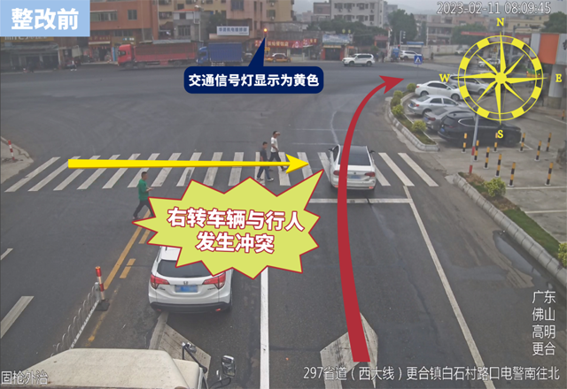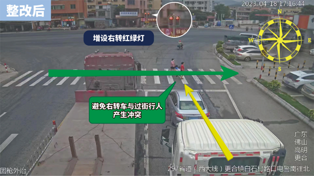 高明区更合大道与Y502乡道路口交通信号灯整改前后对比图。