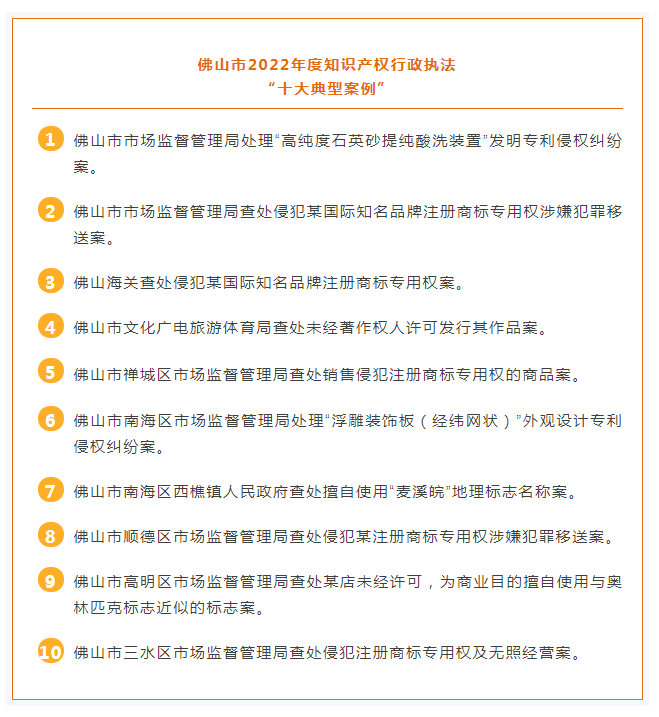 发布会现场还发布了“2022年度佛山市知识产权行政执法十大典型案例”,涵盖全市知识产权行政执法部门办理或查处的涉及专利侵权纠纷、侵犯注册商标专用权、擅自使用地标名称等多种侵犯知识产权类型典型案例,通过发挥典型案例的教育示范作用,提升公众尊重和保护知识产权的意识。