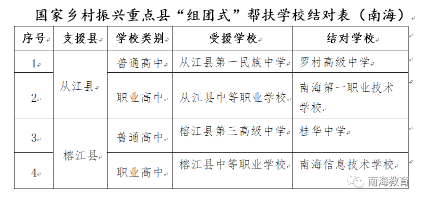 2022年,根据中组部、教育部等八部委关于“每个县要对口帮扶建好1所普高和1所中职”的工作要求,南海区按照“副校长+中层+专任教师”模式,认真组织选派“组团式”教育人才16人,其中副校长4人、中层4人、专任教师8人,前往对口支援2个国家乡村振兴重点县——从江县和榕江县开展“组团式”帮扶工作,选定罗村高级中学、南海第一职业技术学校、桂华中学、南海信息技术学校等4所学校与从江、榕江学校开展结对帮扶,姚汉杰、周立新、白煌明、谢郁等4位南海校长分别对口担任从江一中、从江职校、榕江三中、榕江职校校长。