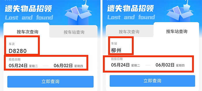 ②如果在列车上遗失物品,选择“按车次查询”;如果在车站内遗失物品,选择“按车站查询”;