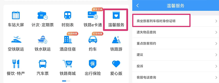 ①在APP首页找到“温馨服务”,选择“乘坐旅客列车临时身份证明”;