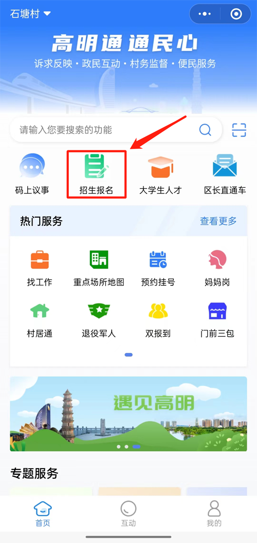 进入“高明通”小程序后,点击“招生报名”,进入预约系统。