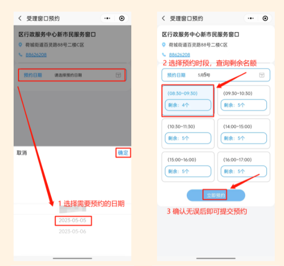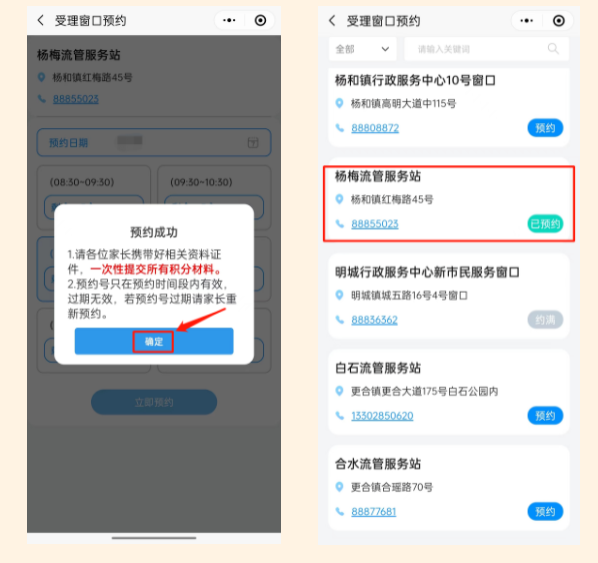 家长可查看各镇街的受理窗口信息,点击“预约”可查看该受理窗口的预约日期、预约时段与剩余名额,家长可按需选择需要预约的日期与时段,确认无误后可提交预约,预约成功的家长将获得个人预约号。