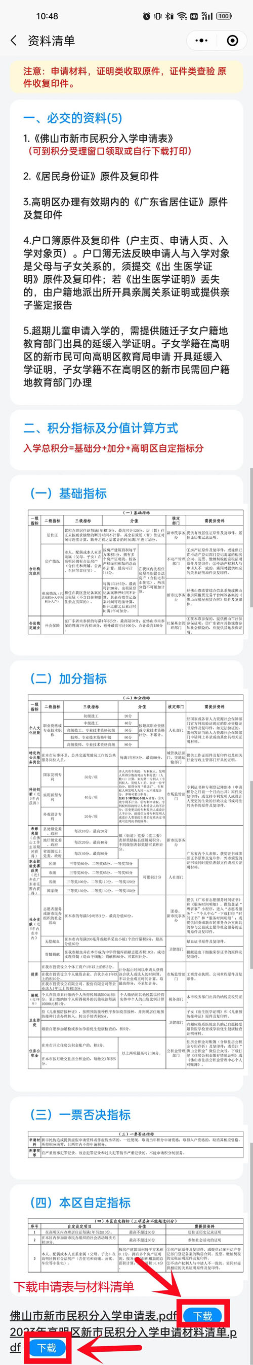 家长在前往受理窗口办理积分入学申请前,须提前准备好相关资料证件,一次性提交所有积分材料,点击“积分入学申请资料清单”可浏览必交资料与积分指标及分值计算方式信息,在页面下方可直接下载佛山市新市民积分入学申请表与2023年高明区新市民积分入学申请材料清单。