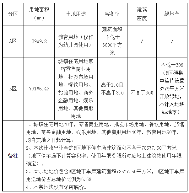 出让宗地:佛山市顺德区大良街道碧桂路以东、德民路以南地块(宗地号:116111-002,版本号1),土地面积:76166.23平方米,交易编号:TD2023(SD)WG0025,根据规划条件,宗地包括A、B两个分区,各分区的用地面积和规划指标详见下表: