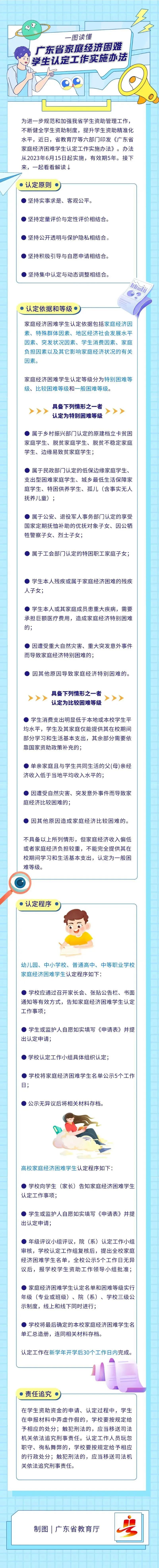 近日,广东省教育厅、省财政厅、省民政厅、省人力资源社会保障厅、省乡村振兴局、省残疾人联合会印发了《广东省家庭经济困难学生认定工作实施办法》,明确了家庭经济困难学生认定原则、认定机构与职责、认定依据和等级、认定程序、责任与监督、法律责任等内容。办法从2023年6月15日起实施,有效期5年。