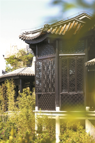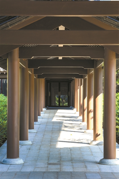 翰墨园内,连廊是颇为重要的要素。徐好好表示,关于连廊的设计,“一方面因为山地地形,所以要做比较曲折的连廊,另一方面,设计团队也考虑到‘移步换景’的特点,廊道路程比较长、坡度和缓,可以让游客在不同的角度看到不同的景色”。徐好好建议市民留意连廊中一段被竹林簇拥的休息地,“此处放眼望过去十分通透,透过青葱的细竹,可以看到不远处的中心阁。”