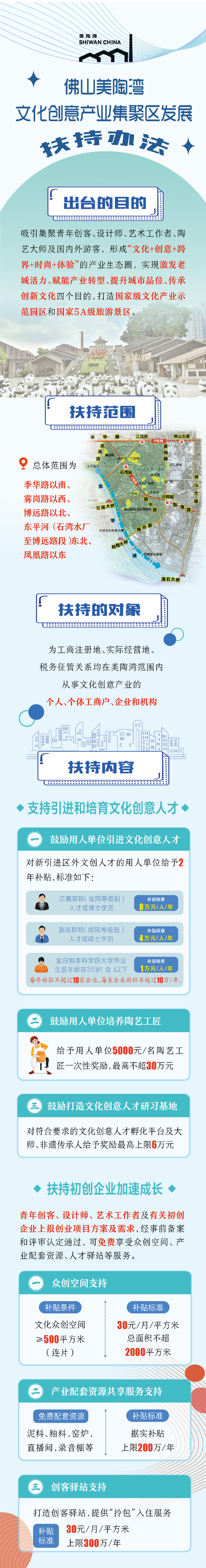5月5日,禅城区政府正式印发实施《佛山美陶湾文化创意产业集聚区发展扶持办法》,美陶湾拿出“真金白银”力促文化创意产业发展,将从引培人才、创业服务、企业引进、产业载体、文化赛事以及陶文化研究等六大方面给予扶持奖励!最高补贴达400万元!