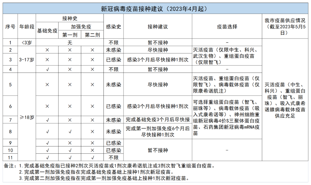 新冠病毒疫苗接种建议(2023年4月起)。来源/佛山市疾控中心