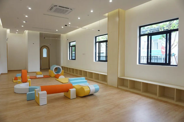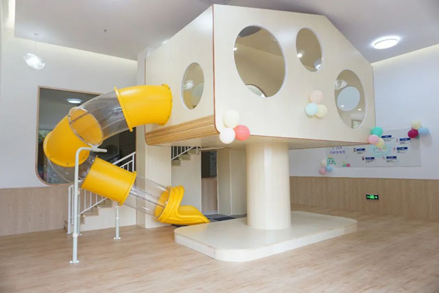 每个班配置配餐台、料理区(换尿布台)、淋浴区、生活区、绘本区等专业功能区域,户外活动场地230平方米,配有跑道、沙池区、游乐设施区、植物角、动物饲养角等功能区域。