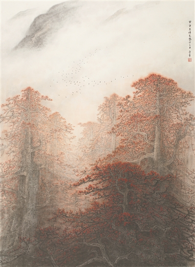 其中,《报春图》创作于2004年,作品通过木棉树热烈、希望、未来的美好寓意,象征改革开放以来广东取得的巨大进步,同时也开创了岭南画派画木棉的新手法。红棉是广州的市花,为了完成这幅作品,老先生几乎遍“访”全广州的木棉树。苍劲的木棉花怒放,远处云山雾罩,流泉飞泻,清晨时红棉树里鸟儿轻啼报春,带来一股春意盎然的力量感,彰显着广州包容、进取、向上的城市气质。