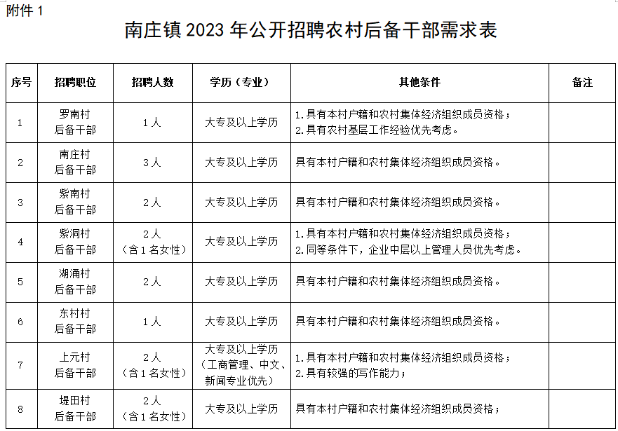 为全面推进南庄镇农村基层干部队伍建设,进一步改善农村干部队伍结构。经南庄镇委研究,决定招聘一批农村后备干部,现将有关招聘事项公告如下: