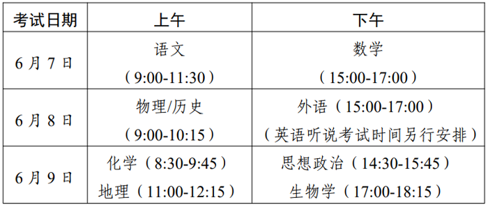 全国统一考试于6月7日开始举行,具体考试时间安排如下: