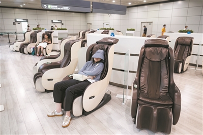 每台按摩座椅均具备按摩、睡眠、充电等功能,座椅自身配备有USB充电接口,免费使用。有需要的旅客还可通过扫码支付启用按摩功能和睡眠模式。