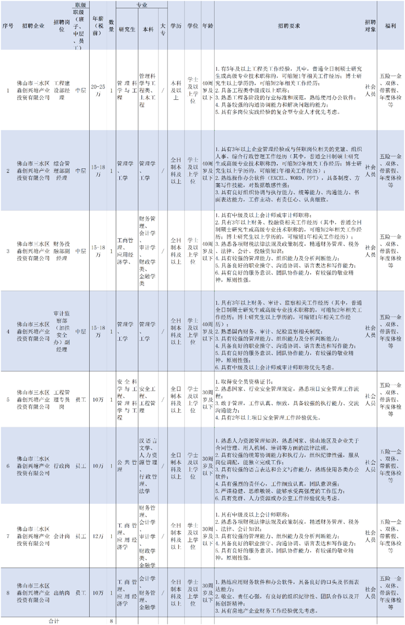佛山市三水区金融投资控股有限公司(以下简称三水金控公司)下属企业佛山市三水区淼创西江产业投资有限公司(以下简称淼创西江公司)、广东淼智创产业投资有限公司(以下简称淼智创公司)、佛山市三水区淼创兴塘产业投资有限公司(以下简称淼创兴塘公司)因业务发展需要,诚向社会公开招聘工作人员21名,有关事项公告如下: