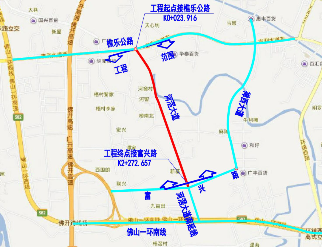 河滘大道:北起樵乐公路,南接富兴路(不含富兴路的平交口),沿线总长约2.25km,双向四车道。