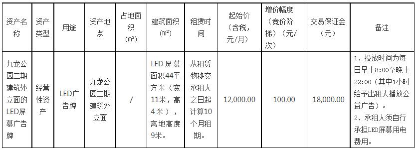 5.电费收取方式:电费采用先使用后交付的方式,每月用电量按实际使用抄表结算,电费计收标准按照供电部门电价基础上另加15%服务费计收。竞得人于每月10日前向出租方缴清上月电费。竞得人在中标后需自行办理广告发布的相关手续。