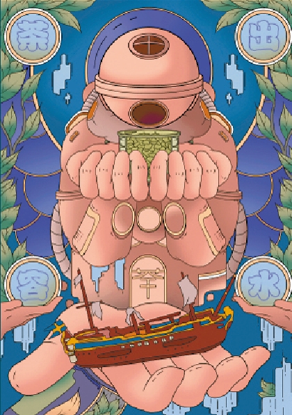 金奖作品“出水茶容”以从瑞典“哥德堡号”沉船打捞出水的、经广州出口的福建白毫茶为元素,将这藏于广州博物馆中、见证了“海丝”繁荣的大宗出口品与潜水员打捞其出水的场景相结合,加以艺术化加工,造成了一件既有古韵又有当代设计表达趣味的佳作。