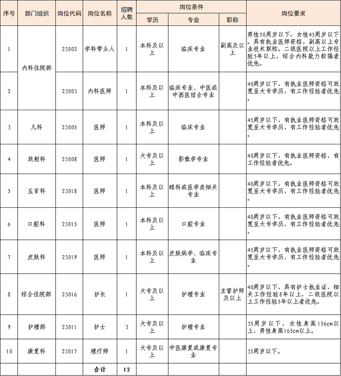医院设置床位200张,开设急诊科、内科、外科、妇产科、康复科等病区,手术室4间,门诊开放内科、外科、妇产科、儿科、全科、康复科、中医科、五官科、体检科等科室,并设置检验科、功能科、放射科、药剂科等辅助科室,配备达到二级综合医院的先进诊疗设备。现因业务发展需要,向社会公开招聘。