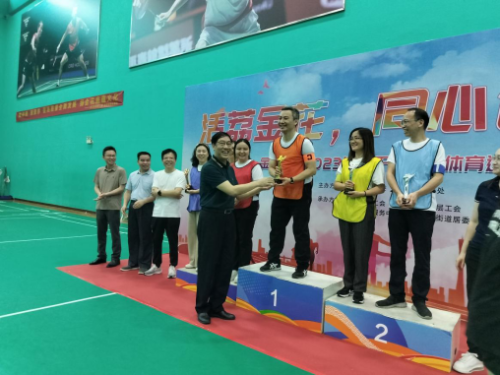(图:金花街道办事处一级调研员黄青坚为获得第一名的队伍颁发奖杯)