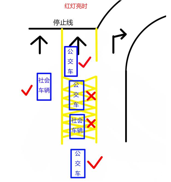 03、在早晚高峰期(7:00--9:00和17:00--19:00),公交专用道上没有车,社会车辆禁止压公交专用道实线,进入该车道停车等灯。