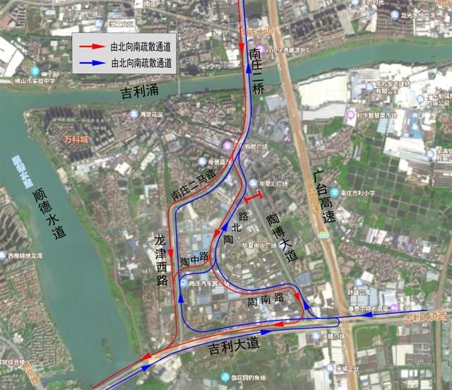吉利大道、陶博城前往南庄二桥方向车辆可由南庄二马路、陶南路—陶北路—南庄二桥绕行。