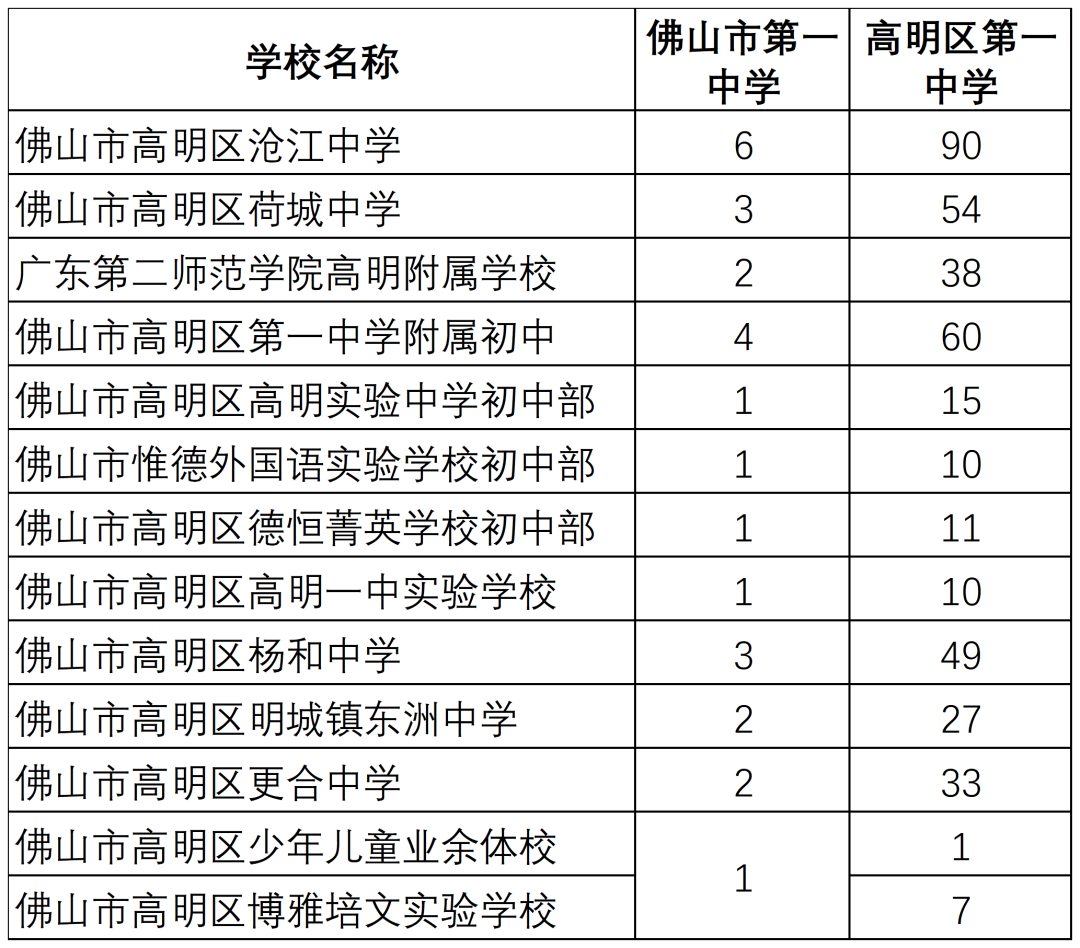 根据《佛山市2023年高中阶段学校招生考试工作意见》精神,佛山市第一中学、高明区第一中学各安排50%的普通生计划名额分配(指标生)招生。佛山市第一中学名额分配面向全市招生,高明区第一中学面向区内招生,按符合基本条件资格考生人数比例分配至初中学校,现将名额分配情况公布如下。