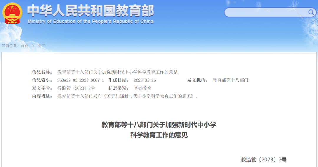 教育部校外教育培训监管司负责人指出,基础教育阶段是“孵化”学生科学精神、创新素质的决定性阶段,中小学校的科学教育质量对培养学生科学素质至关重要。