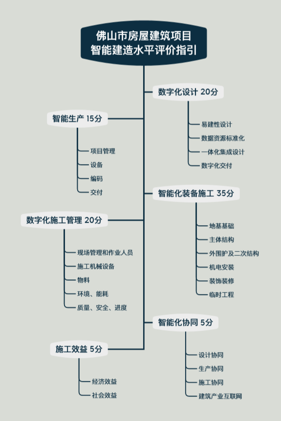 2022年10月,佛山入选全国首批智能建造试点城市,按照国家和省关于推动智能建造与建筑工业化协同发展的工作部署,并迅速印发实施《佛山市智能建造试点城市工作方案》,通过政策支撑引领、标准体系建设、试点示范打造等多方面推进试点工作。为进一步加快打造试点示范项目,建立健全智能建造房屋建筑项目层面评价体系,强化智能建造水平技术论证,我局先行先试,组织编制并印发《评价指引》。