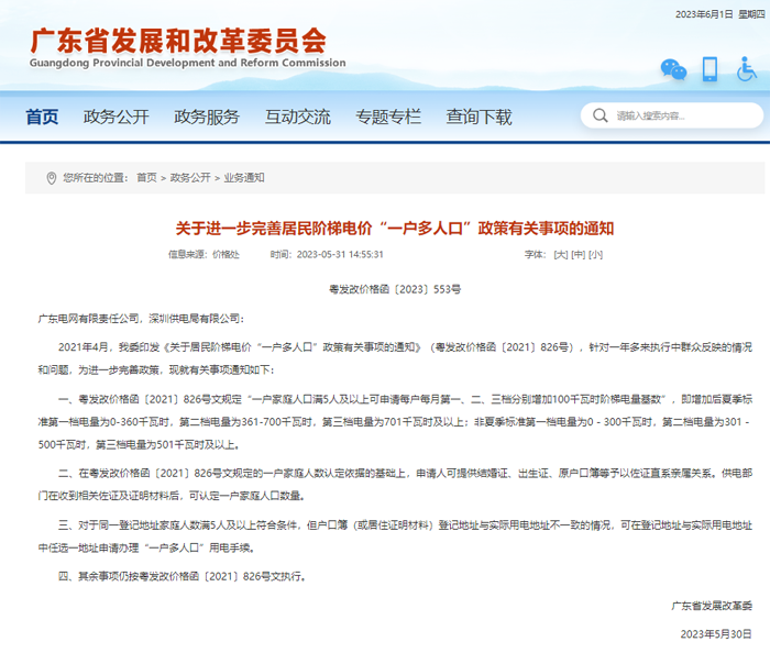 为适当减轻多人口家庭的电费负担,广东省自2021年6月1日起实施了居民阶梯电价“一户多人口”优惠政策。