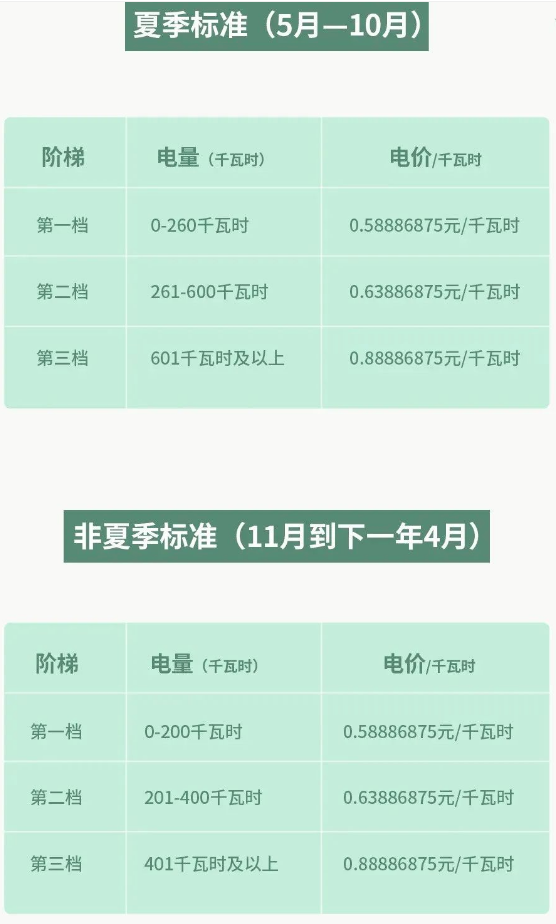 即增加后夏季标准第一档电量为0-360千瓦时,第二档电量为361-700千瓦时,第三档电量为701千瓦时及以上;非夏季标准第一档电量为0-300千瓦时,第二档电量为301-500千瓦时,第三档电量为501千瓦时及以上。