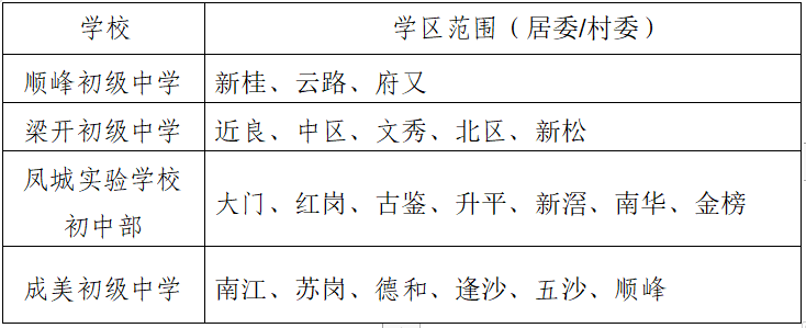 符合转学申请条件的学生,小学选择其中一所学位供给学校报名,初中到学生户籍所在学区的学校报名。顺峰初级中学学区的学生可以选择在凤城实验学校、梁开初级中学、成美初级中学报名。