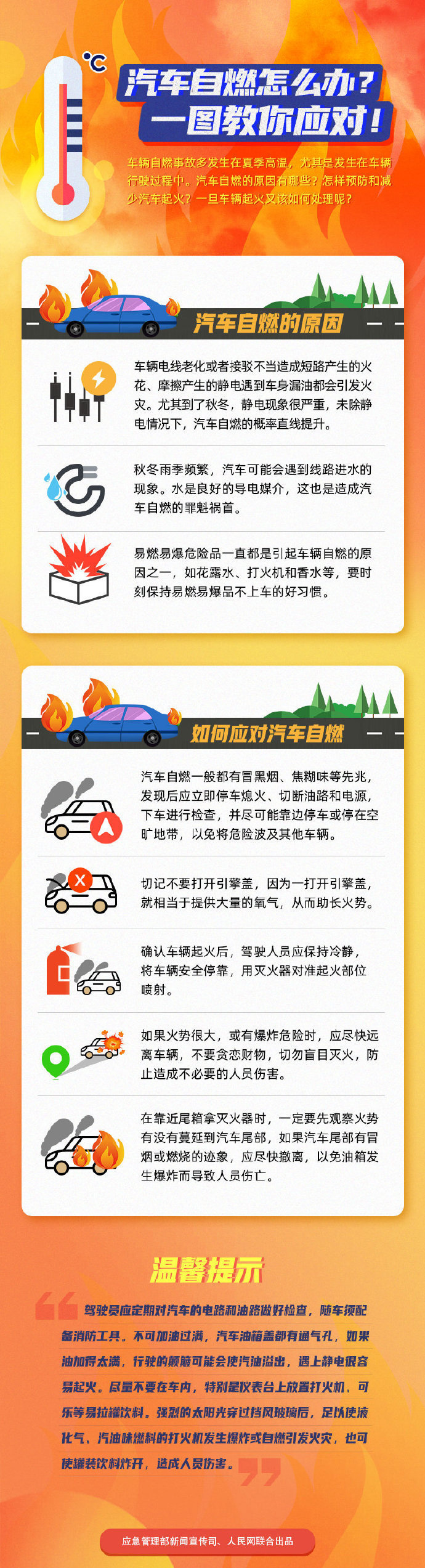 同时,民警取出警车内灭火器对自燃车辆进行紧急处置,随后与消防救援队员共同将火源成功扑灭,事故未造成人员伤亡。