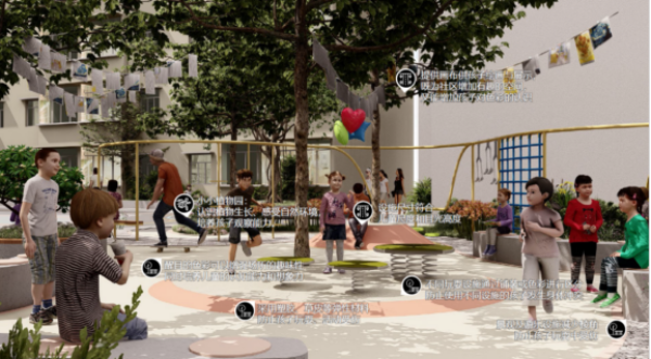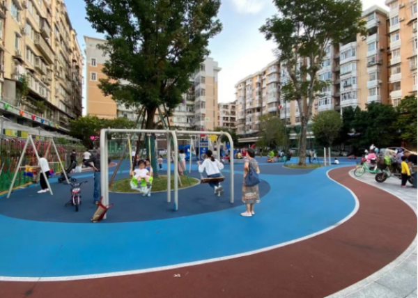 海珠区南华西街道海天社区,利用三面住宅围合空间,通过场地塑造、游戏设施完善、IP形象植入以及儿童偏好色彩标识,构建有围合感、安全感、活力、多元的儿童活动空间。家长可在家观察儿童活动的情况,增强了家长与儿童的安全感。同时引导儿童与看护人群通过活动交流增强亲子关系,打造全年龄共融的社区交往场景。